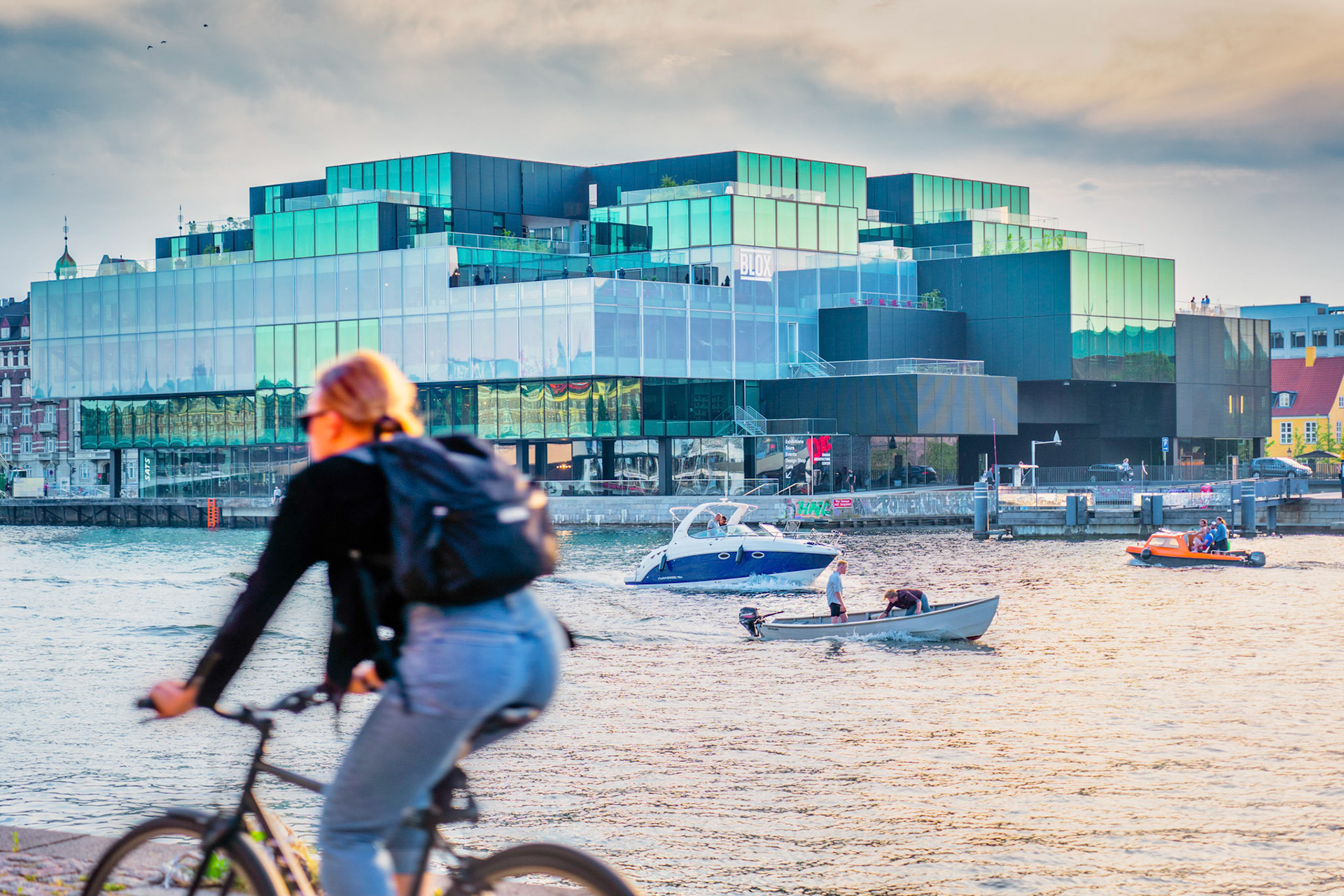Runners on boardwalk by the Copenhagen Waterfront, Knippelsbro (Knippel's Bridge) and Cirkelbroen (Circle Bridge) in the background